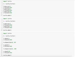 turtle.done()次回はさらに菱形、台形(平行四辺形)、星型、葉っぱ型の描き方を紹介していきます。