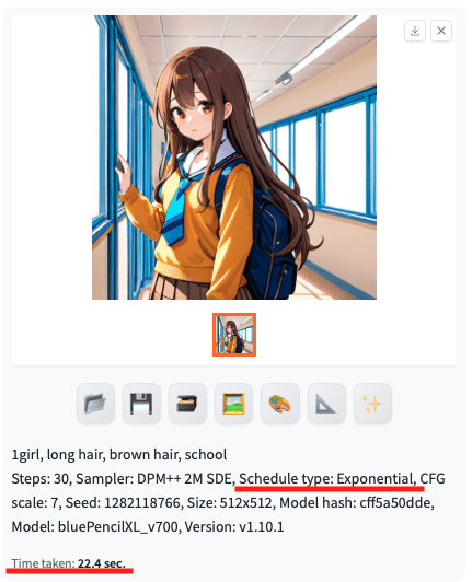 ちなみにこの画像生成ではSchedule typeは「Exponential」が使われ、22.4秒で生成したようです。
