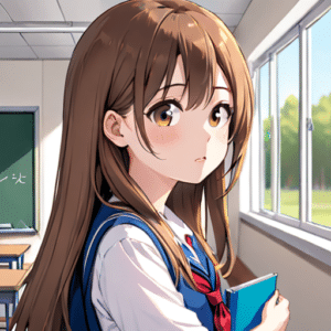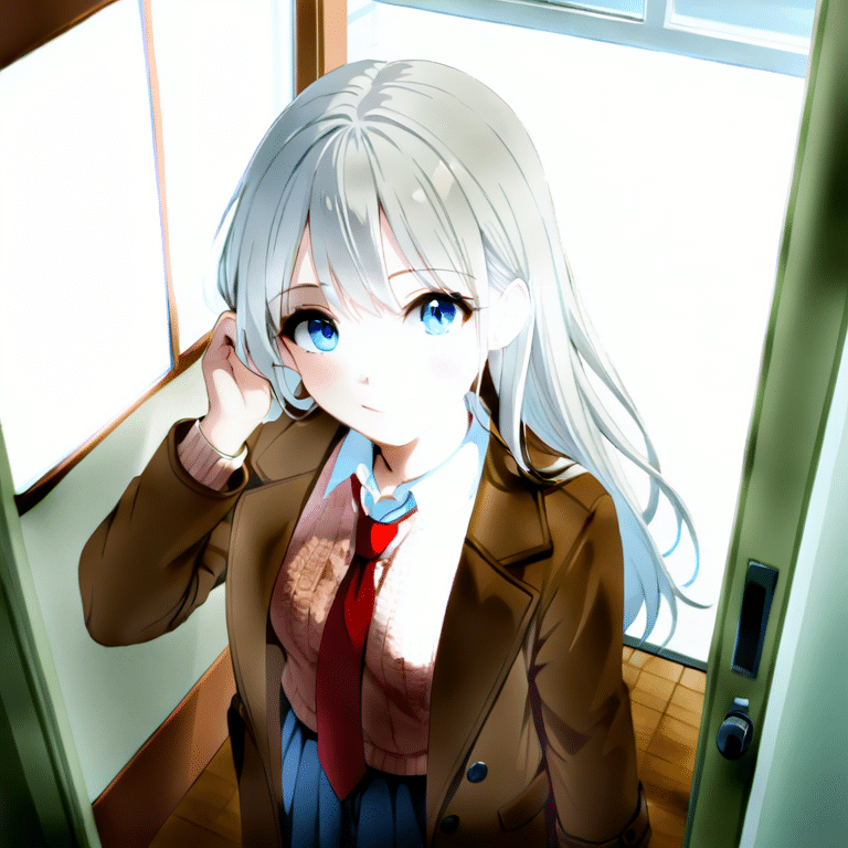 一人の女の子で、髪はロングでシルバー、目は青色、笑っていて、上から見ている感じで、上半身をメイン、茶色のロングのコート、赤いネクタイ、淡いピンクのセータを着ていて、立っている、髪をかき上げていて、右手には時計をしている、学校で、窓がなく、ドアがあり、室内、壁掛け時計がある