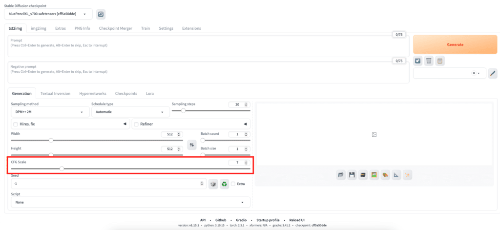 まずはCFG ScaleがWeb UIのどこにあるか確認してみましょう。