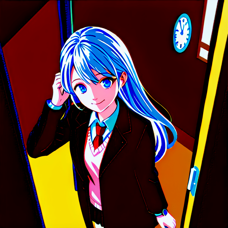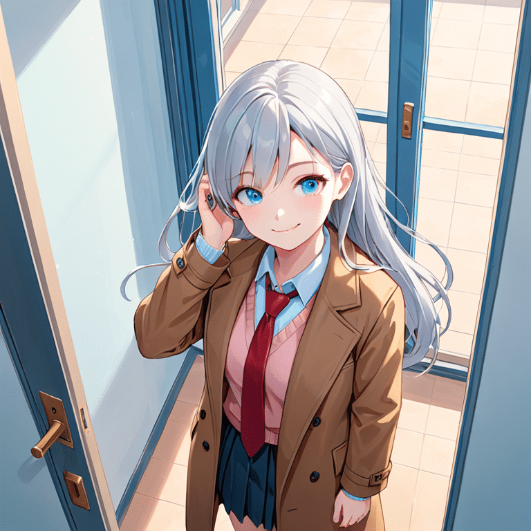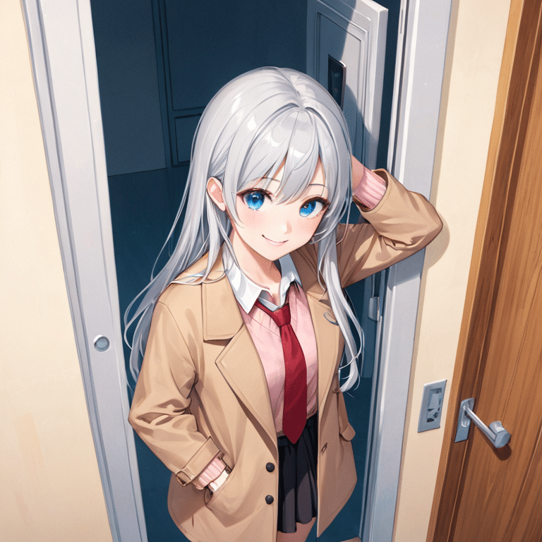 Prompt: 1girl, solo, long hair, silver hair, blue eyes, smiling, from above, upper body, brown long coat, red tie, light pink sweater, standing, hand in own hair, watch on right arm, school, no window, door, indoor, clock